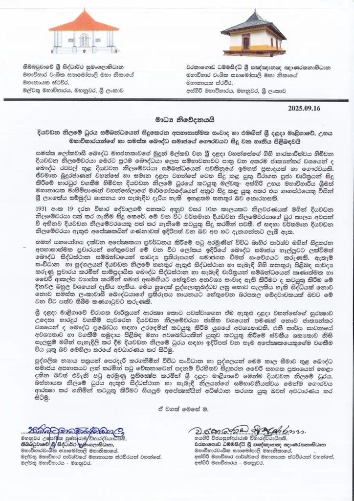 The Mahanayake Theras of the Malwathu and Asgiri Chapters have issued a statement regarding the post of Diyawadana Nilame, drawing attention to the defamatory discussions surrounding the position and the resulting harm caused to the dignity of the Sri Dalada Maligawa, the two great temples, and the Buddhist community at large.